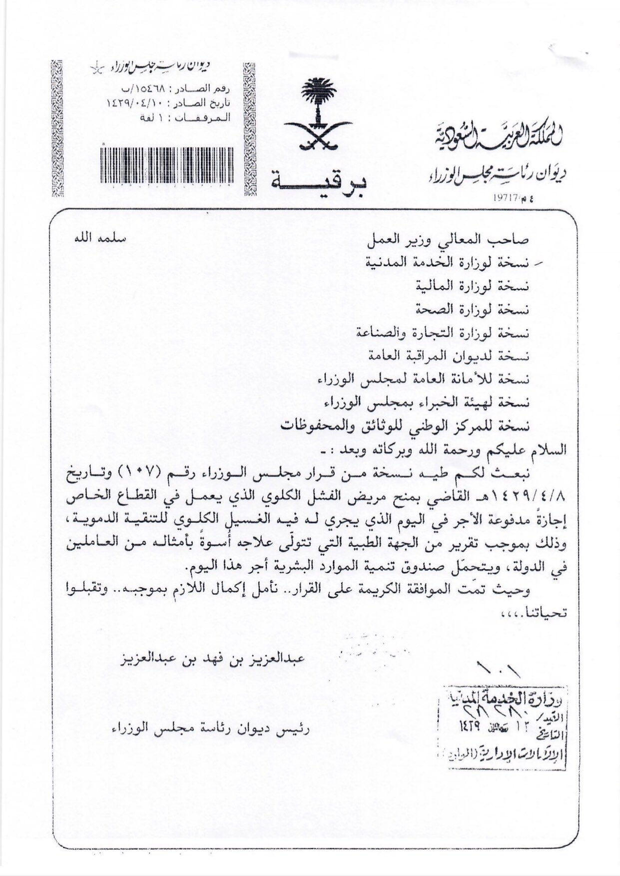 سلطان بن عساف السحمه On Twitter قرار رئيس مجلس الوزراء رقم ١٠٧ وتاريخ ٠٨ ٠٤ ١٤٢٩ المتضمن منح مريض الفشل الكلوي الذي يعمل في القطاع الخاص إجازة مدفوعة