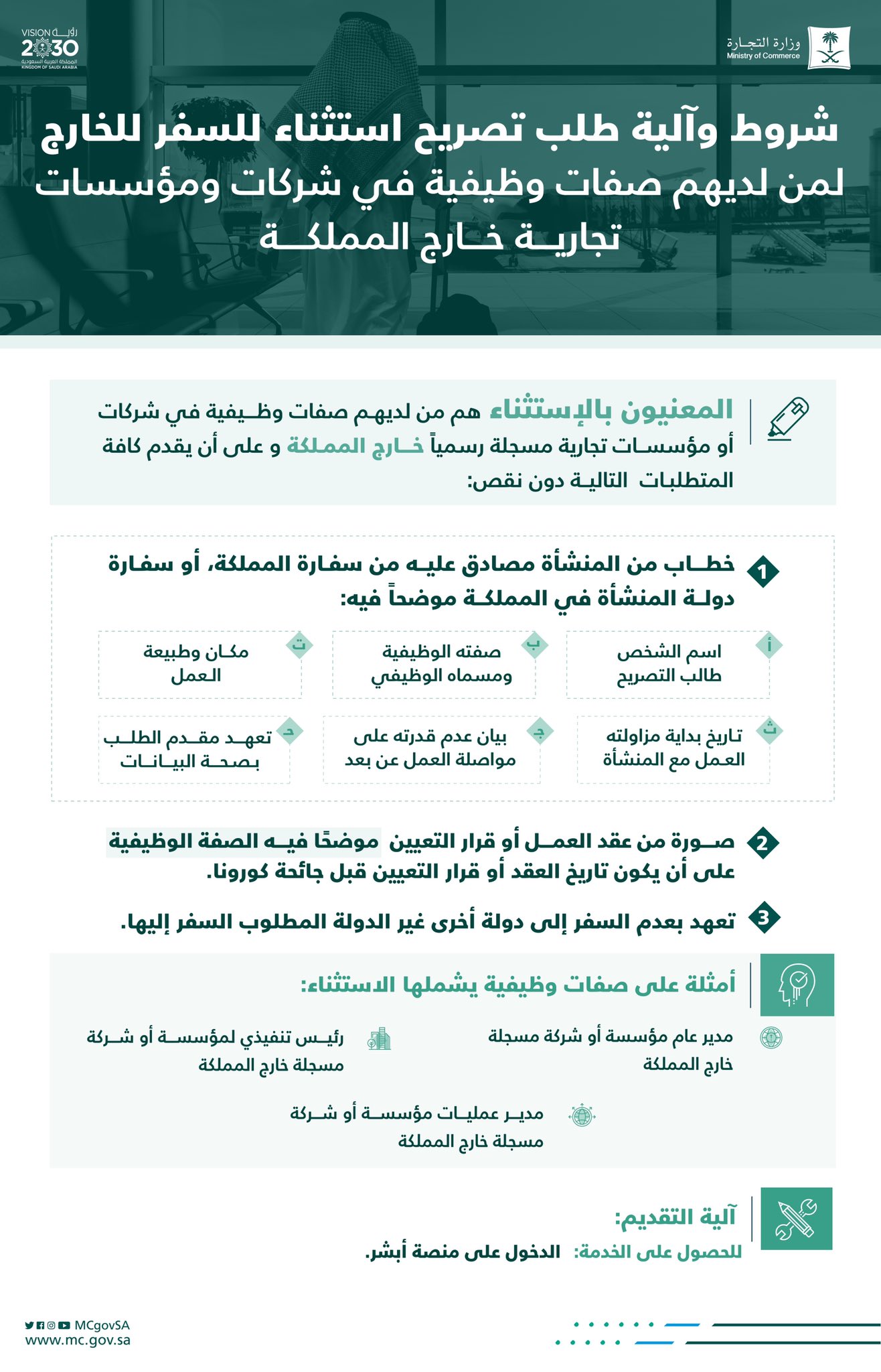 وزارة التجارة On Twitter تعر ف على شروط وآلية طلب تصريح استثناء للسفر للخارج لمن لديهم صفات وظيفية في شركات ومؤسسات تجارية خارج المملكة