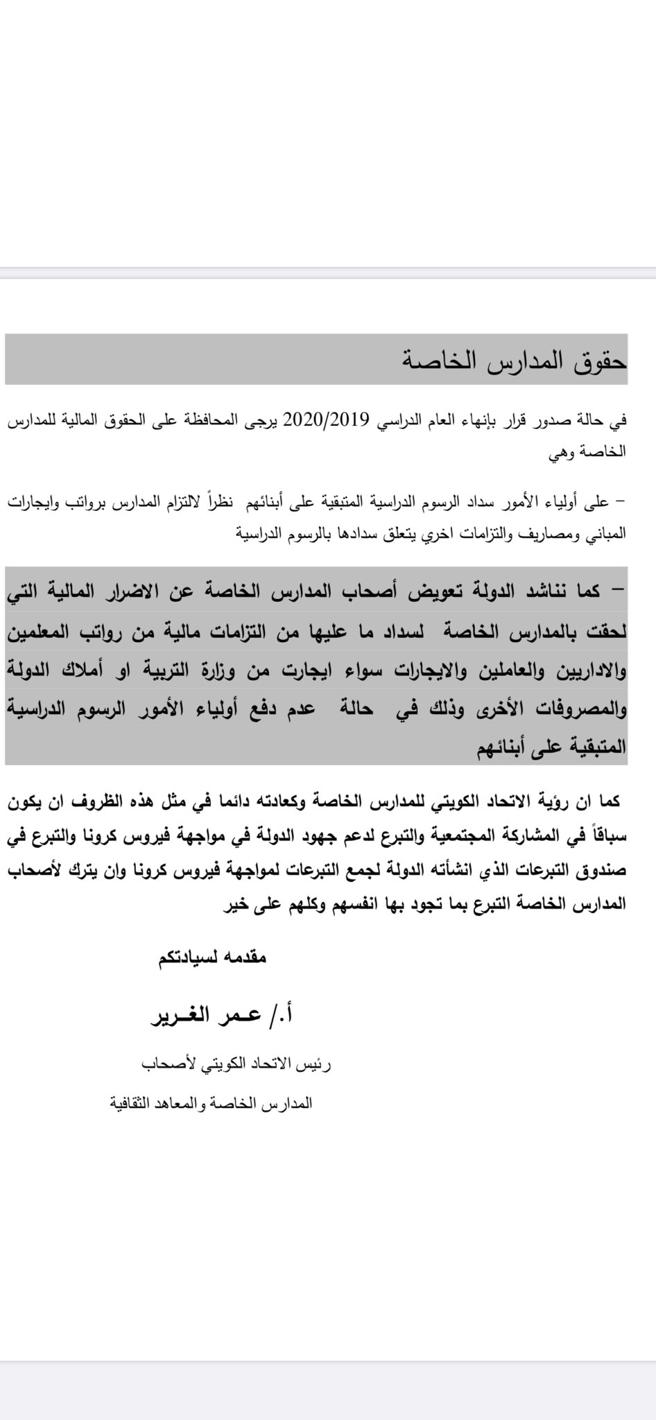 ماضي الخميس On Twitter أغلب اصحاب المدارس الخاصة في الكويت أصدروا بيان يعترضون فيه على مطالب اتحاد المدارس الأهلية الذي تقدم بطلبات استغربها أغلب الشعب وأولياء الأمور في هذا التوقيت وجعل
