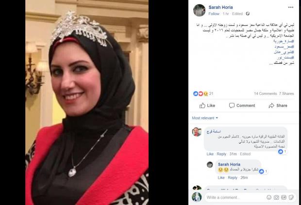 سارة حورية ملكة جمال المحجبات في مصر تنفي زواجها من معز مسعود سورية 24